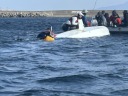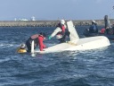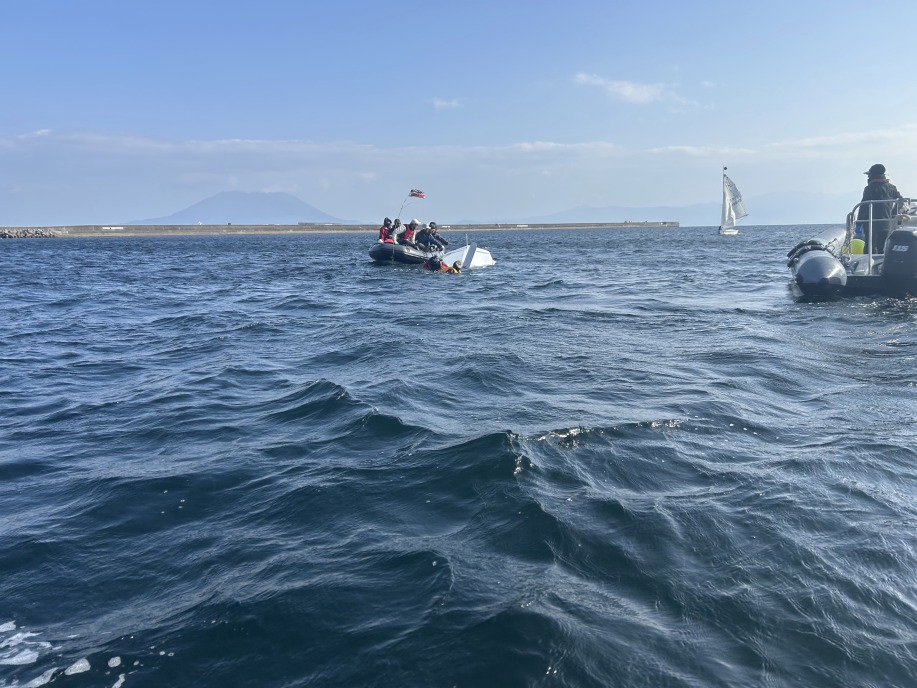 | 2月最初の練習日、まだ「寒い」のか、参加者は少なく、6名集まりました。 快晴でしたが、途中から風が上がる予報でした。2艇艤装して、出艇。 風は北北西、上下のマークを打ってコース練習を始めようとしていました。 ところが、上マーク付近で1艇が沈。風が上がってきたタイミングで、沈おこし してはまた沈の状況でした。アンカーを打っていたためオーシャンのアーリーは 接近が遅く、近くに居たジュニアの黒ゴムが近づきました。近くで練習していた 国際大の学生に手伝ってもらって、2人を上げました。その後、沈起こしが出来ました。 その後、さらに風が上がったので、着岸にしました。 夏の沈起こしを練習しましたが、冬場は体温が下がるので思うように行きません。 これも、良い経験になりました。世話していただいたみなさん、ありがとうございます。 |