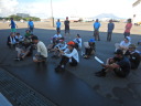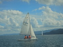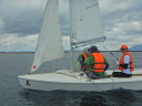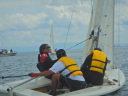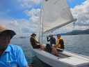 午後は、港外に出て、横風セーリングと方向転換(ティラーの持ち替え)をしました。風の振れと